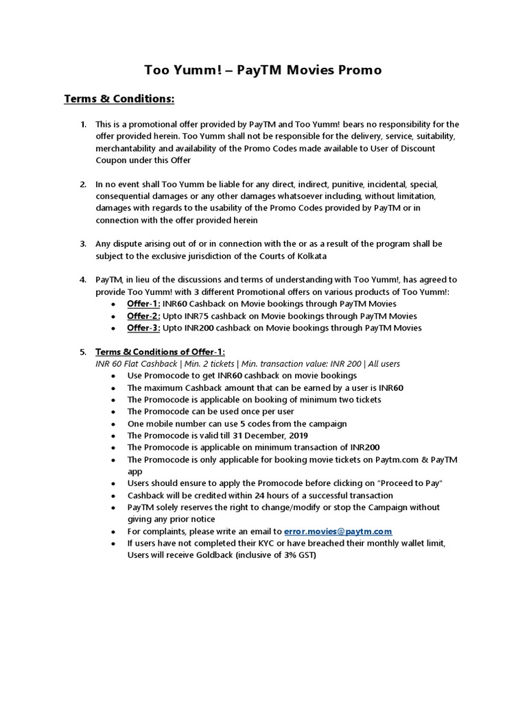 1. This is a promotional offer provided by PayTM and Too Yumm! bears no responsibility for the