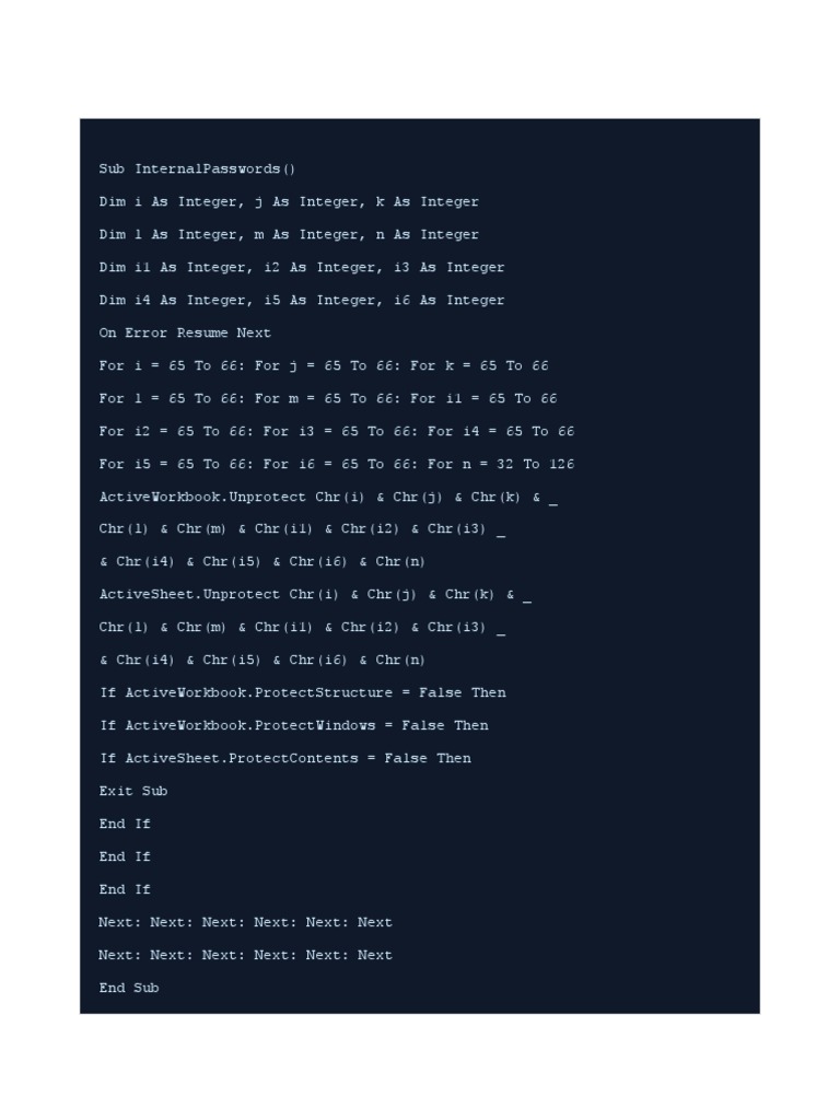 The document contains code that attempts to iterate through all possible 6 character passwords to try and unlock protection on a workbook and worksheet. It uses nested For loops to iterate through all ASCII character values for each password character.