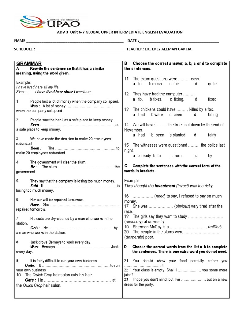 ADV 3 Unit 6-7 GLOBAL UPPER INTERMEDIATE ENGLISH EVALUATION