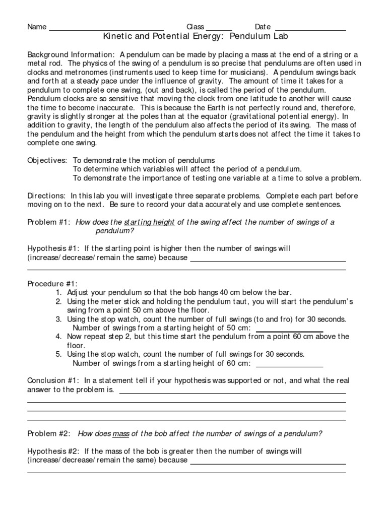 Kinetic and Potential Energy: Pendulum Lab