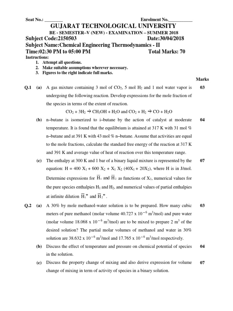 Q.1 (a) A gas mixture containing 3 mol of CO2, 5 mol H2 and 1 mol water vapor is 03