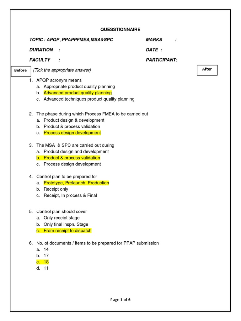 TOPIC : APQP ,PPAPPFMEA,MSA&SPC MARKS :