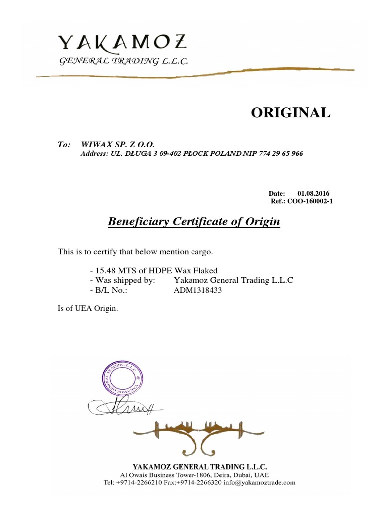 Beneficiary Certificate of Origin