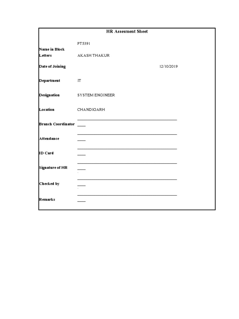 HR Assessment Sheet for Employee Records