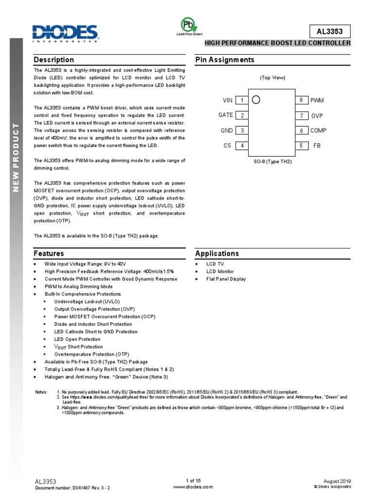 Notes: 1. No purposely added lead. Fully EU Directive 2002/95/EC (RoHS), 2011/65/EU (RoHS 2) & 2015/863/EU (RoHS 3) compliant.