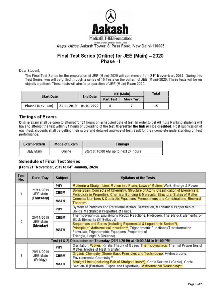 The Final Test Series for the preparation of JEE (Main) 2020 will commence from 21st November, 2019. During this