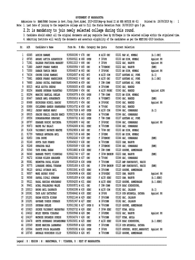 Admissions to BAMS/BUMS Courses in Govt./Corp./Govt.Aided, 2019-2020(Mop-up Round II AS PER NOTICE NO 41) Printed On :26/09/2019 Pg : 1