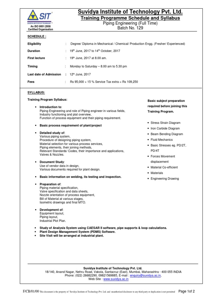 F/CB/01/00 This document is the property of ‘Suvidya Institute of Technology Pvt. Ltd. and unauthorised disclousre to any third party or duplication is not permitted Page 1of 2