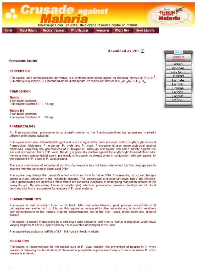 primaquine are reached in 1 to 3 hours. Primaquine as compared to other antimalarials, is found in relatively