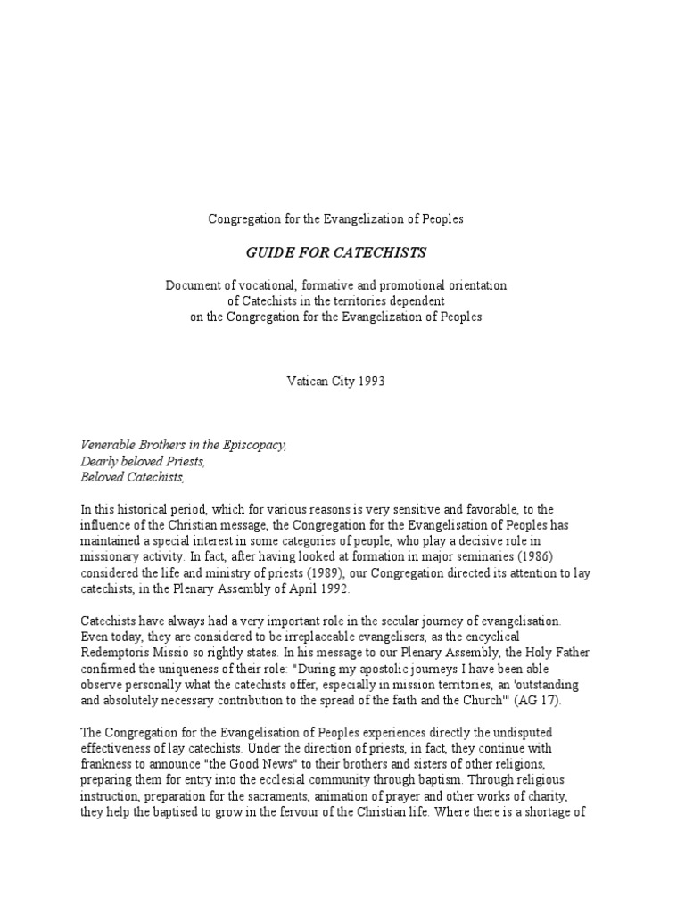 The present Catechists' Guide, fruit of the last Plenary Assembly, expresses the concern of the