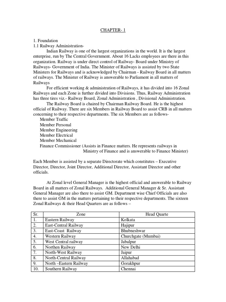 organization. Railway is under direct control of Railway- Board under Ministry of