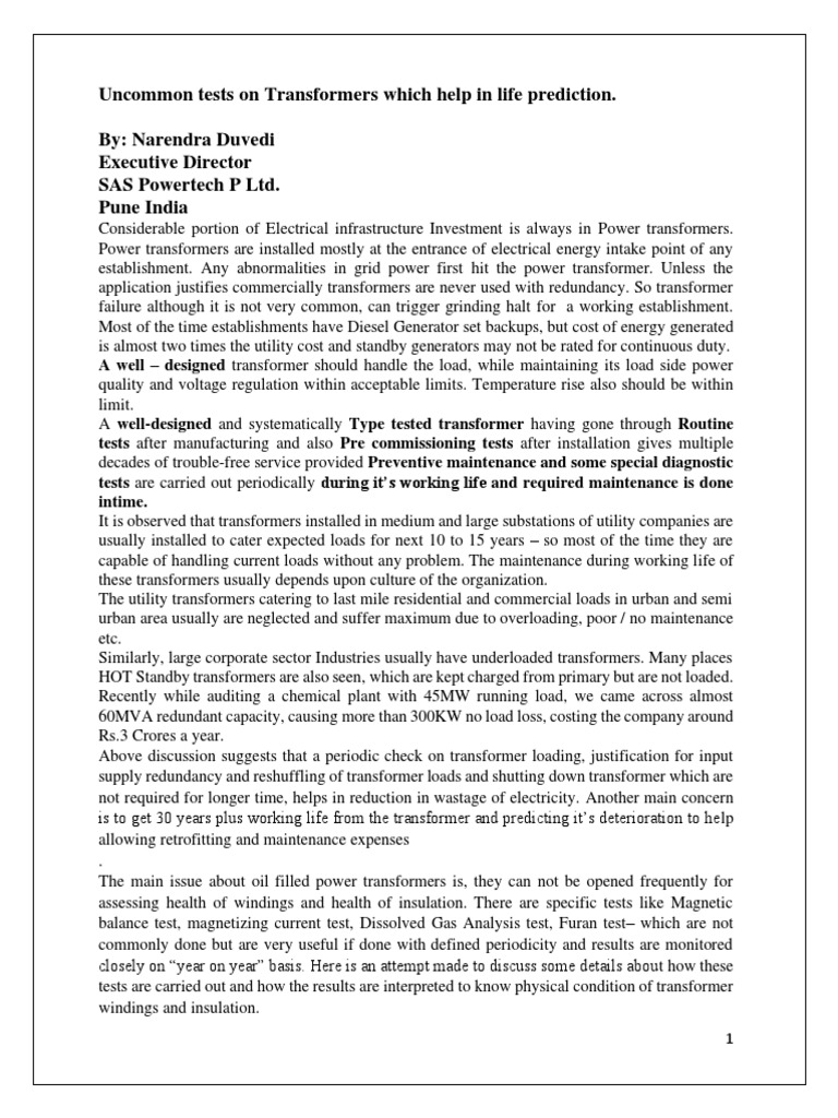 internal healthiness of electrical power transformer. That is why it becomes necessary to analyze