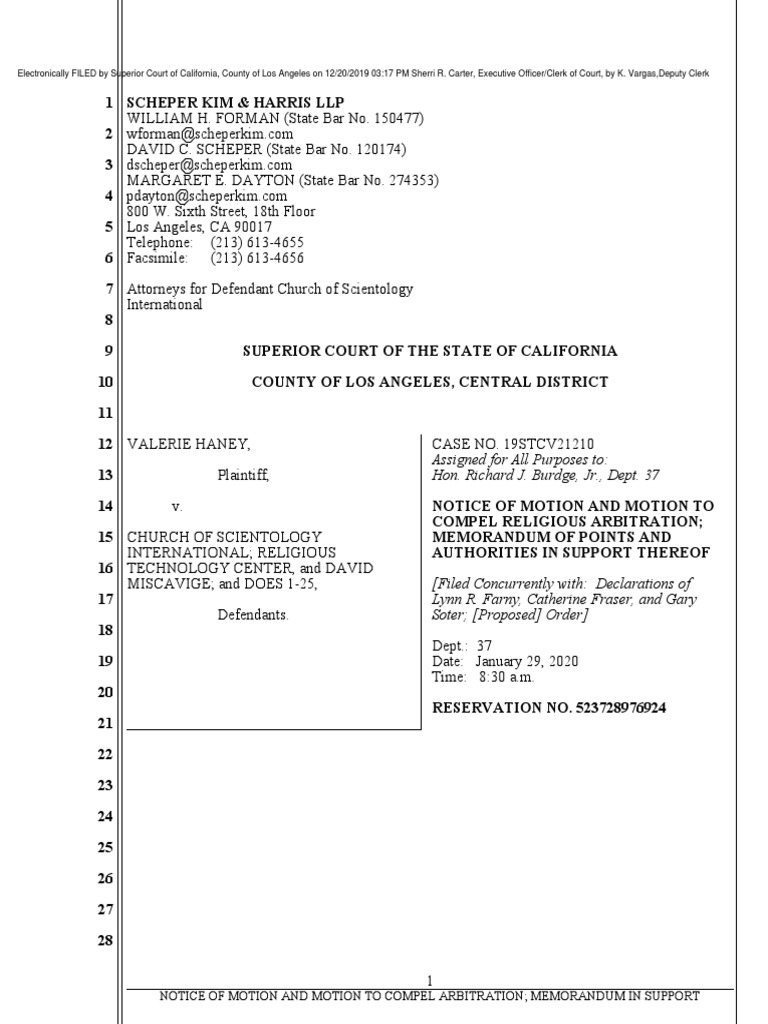 : PLEASE TAKE NOTICE THAT on January 29, 2020, at 8:30, a.m., or as soon thereafter as counsel may be heard in Department 37 of the above entitled Court, located at 111 North Hill Street, Los Angeles, California 90012, Defendant Church of Scientology International (“CSI”) will and hereby does move the Court for an order compelling Plaintiff Valerie Haney, a former member of the Sea Organization (“Sea Org”), the religious order of Scientology, to comply with her repeated written warranties as a lifetime Sea Org member, to forego litigation with Scientology entities and to pursue resolution of any and all disputes that might arise between her and any Scientology entity or official according to Scientology Scripture utilizing the internal justice procedures of the Church, including binding religious arbitration, and staying this matter pending final conclusion of those proceedings. This motion is made pursuant to the First Amendment, the Due Process and Equal Protection clauses of the First Amendment, the California Constitution, the Federal Arbitration Act, and California Code of Civil Procedure Section 1281.2,