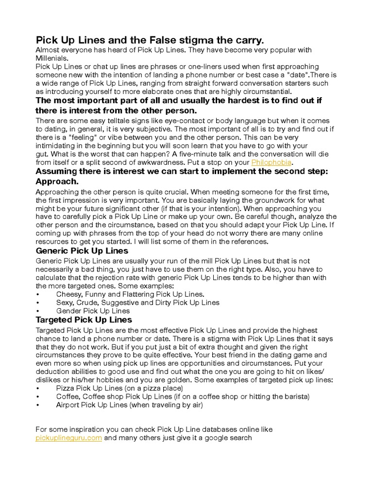 chance to land a phone number or date. There is a stigma with Pick Up Lines that it says