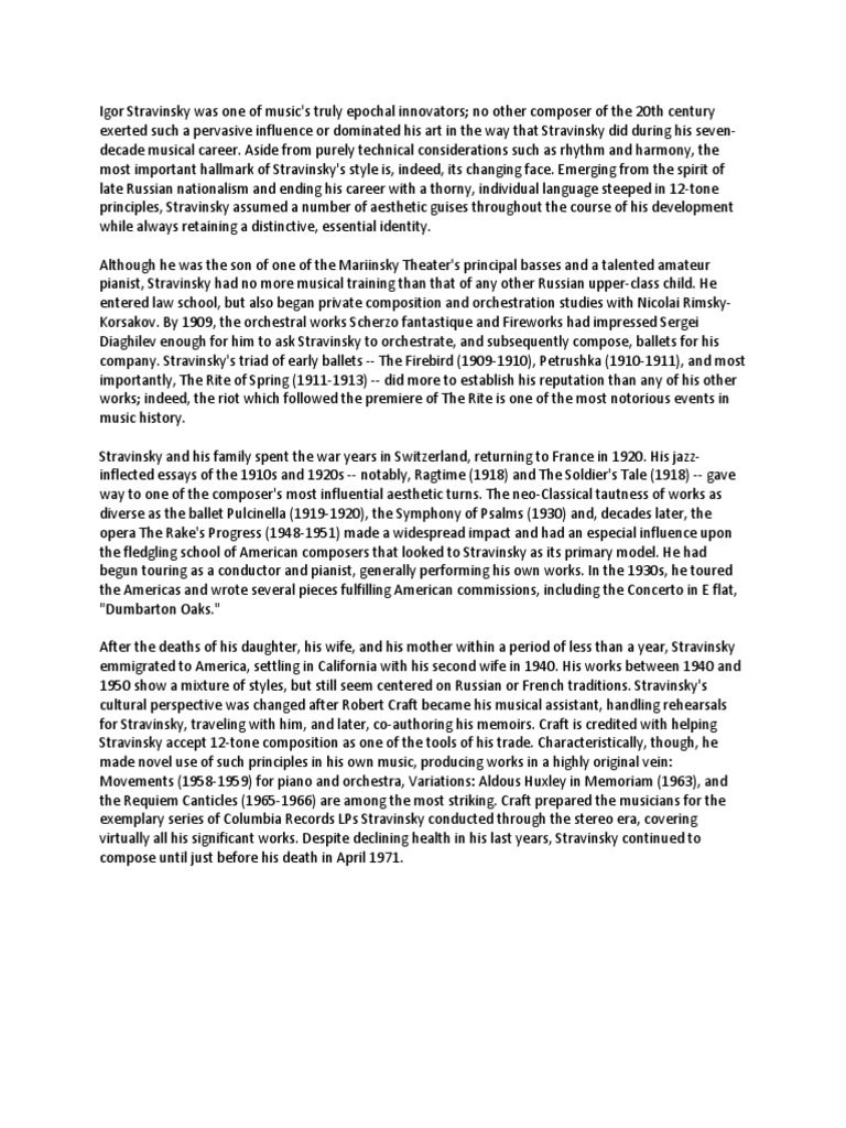 virtually all his significant works. Despite declining health in his last years, Stravinsky continued to