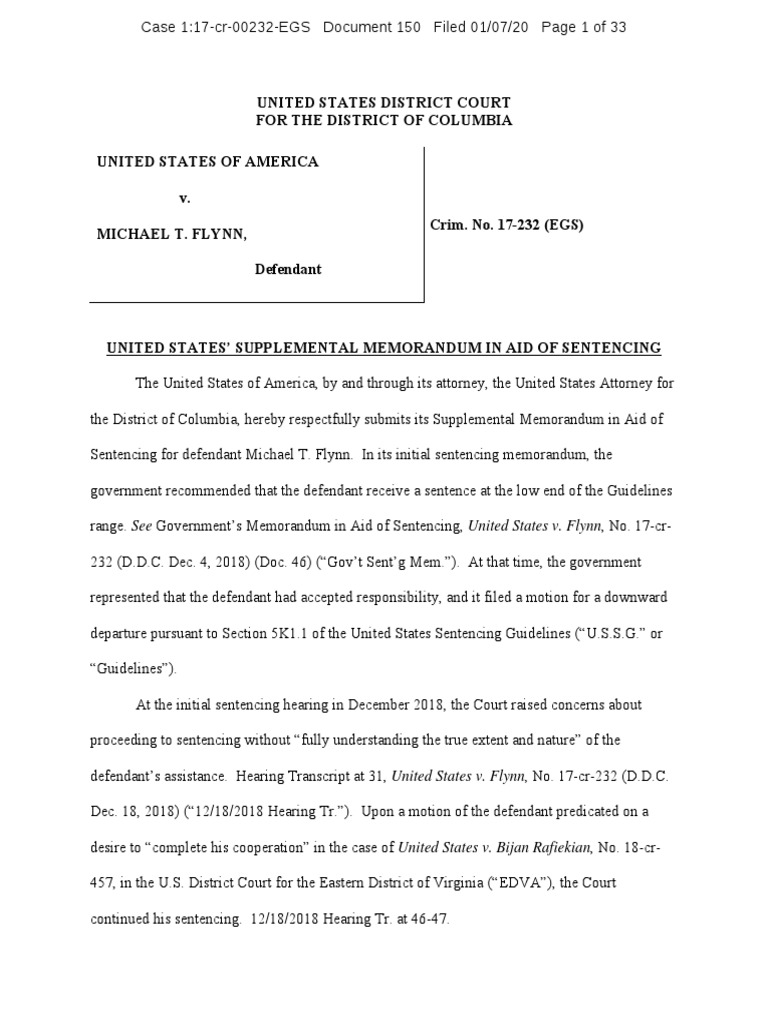 The United States of America, by and through its attorney, the United States Attorney for the District of Columbia, hereby respectfully submits its Supplemental Memorandum in Aid of Sentencing for defendant Michael T. Flynn. In its initial sentencing memorandum, the government recommended that the defendant receive a sentence at the low end of the Guidelines range.