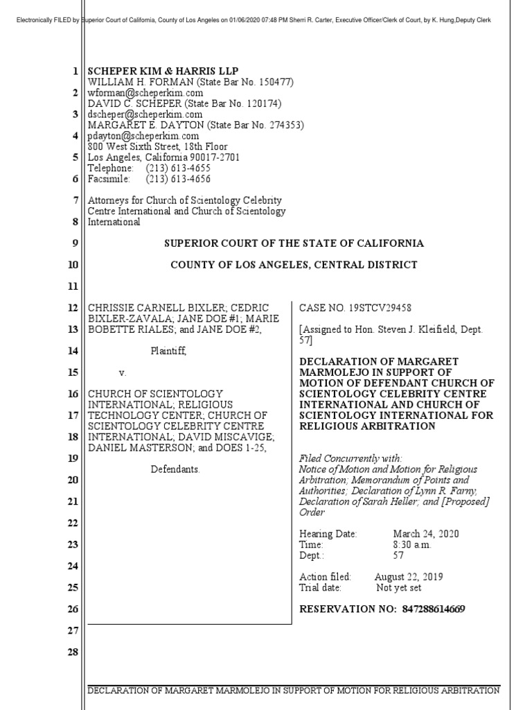 DECLARATION OF MARGARET MARMOLEJO IN SUPPORT OF MOTION OF DEFENDANT CHURCH OF SCIENTOLOGY CELEBRITY CENTRE INTERNATIONAL AND CHURCH OF SCIENTOLOGY INTERNATIONAL FOR RELIGIOUS ARBITRATION
