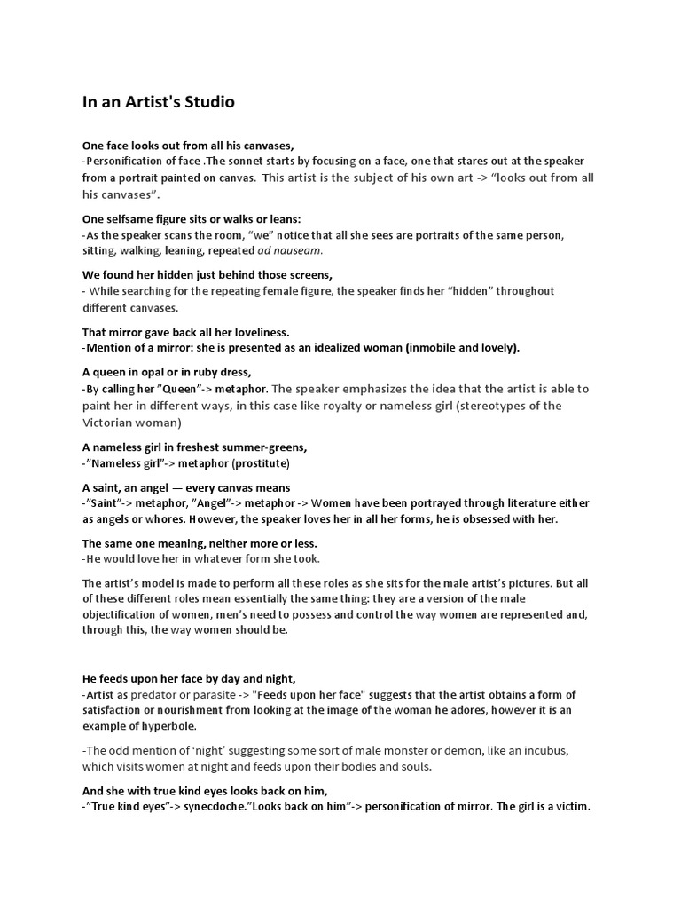-Artist as predator or parasite -> "Feeds upon her face" suggests that the artist obtains a form of