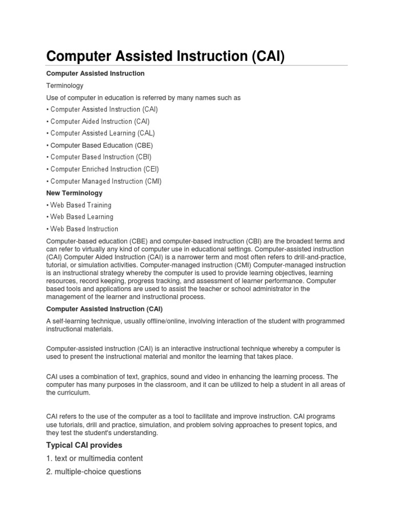 CAI refers to the use of the computer as a tool to facilitate and improve instruction. CAI programs