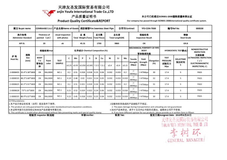 需方 Buyer name CONRAHSE S.A.C 产品名称Name of Goods 消防钢管Fire Seamless Steel Pipe 合同号Contract YFS-CON-7000 编号Ref No 000530