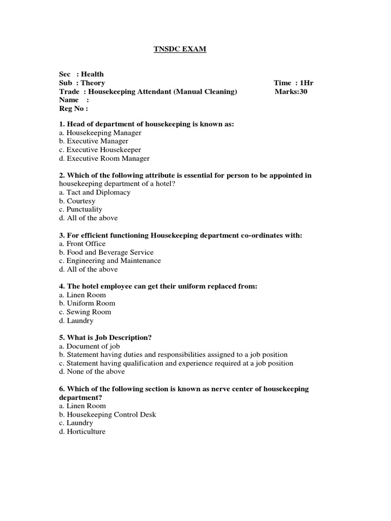 Trade : Housekeeping Attendant (Manual Cleaning) Marks:30