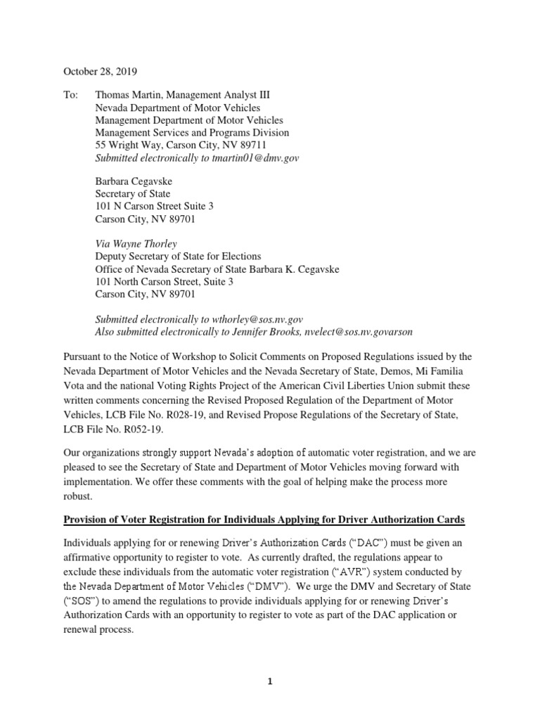This Site Pursuant to the Notice of Workshop to Solicit Comments on Proposed Regulations issued by the Nevada Department of Motor Vehicles and the Nevada Secretary of State, Demos, Mi Familia Vota and the national Voting Rights Project of the American Civil Liberties Union submit these written comments concerning the Revised Proposed Regulation of the Department of Motor Vehicles, LCB File No. R028-19, and Revised Propose Regulations of the Secretary of State, LCB File No. R052-19. Our organizations