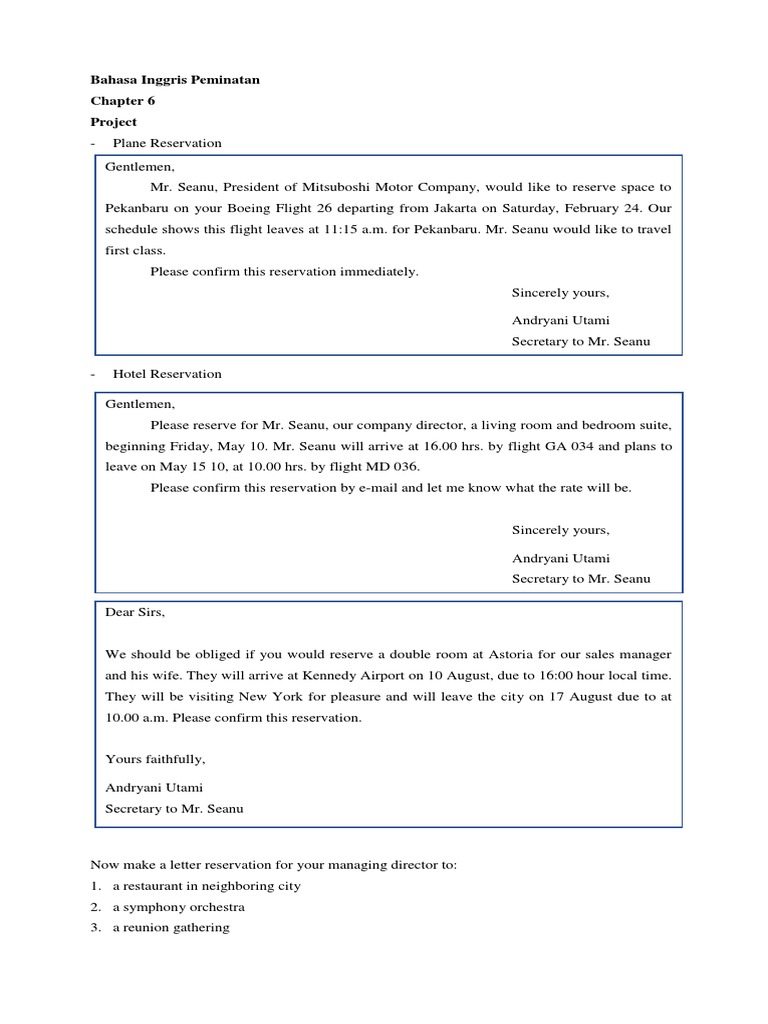 Now make a letter reservation for your managing director to: