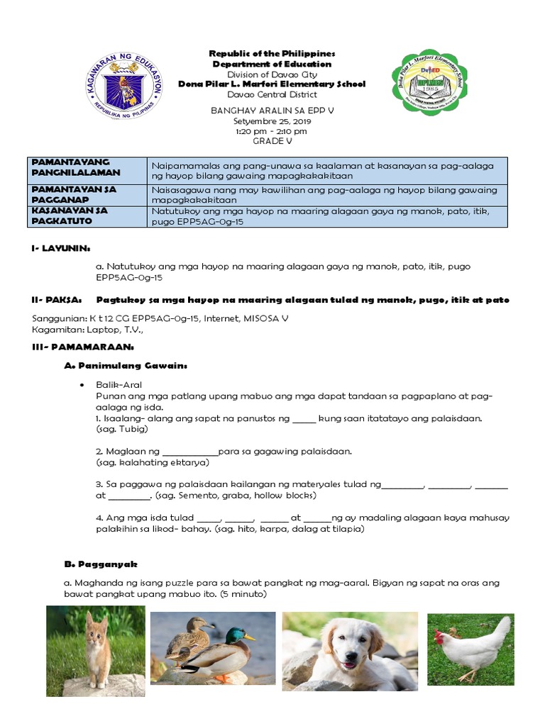 a. Natutukoy ang mga hayop na maaring alagaan gaya ng manok, pato, itik, pugo