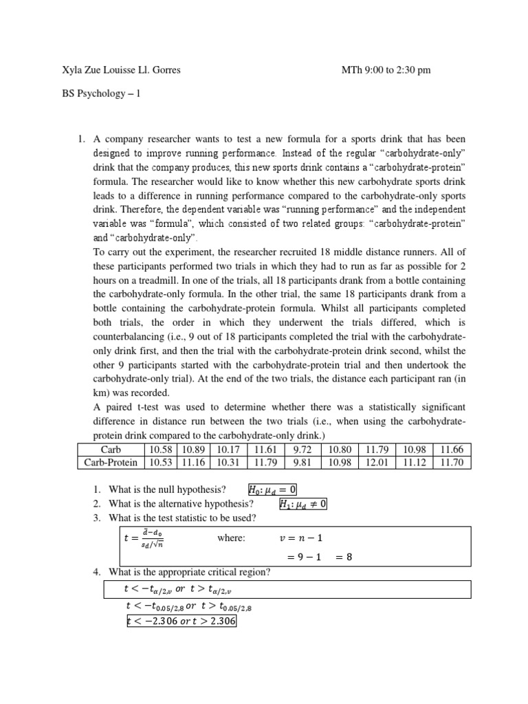 formula. The researcher would like to know whether this new carbohydrate sports drink