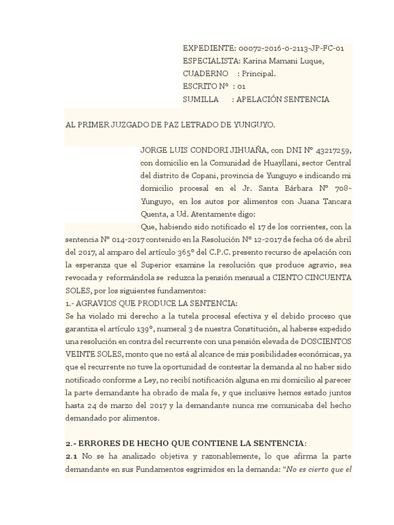 EXPEDIENTE: 00072-2016-0-2113-JP-FC-01