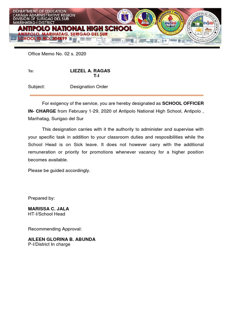 For exigency of the service, you are hereby designated as SCHOOL OFFICER