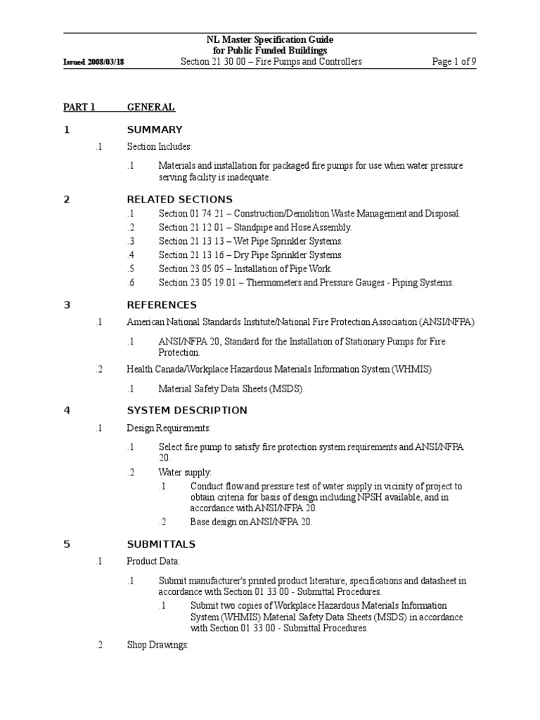 Issued 2008/03/18 Section 21 30 00 – Fire Pumps and Controllers Page 1 of 9