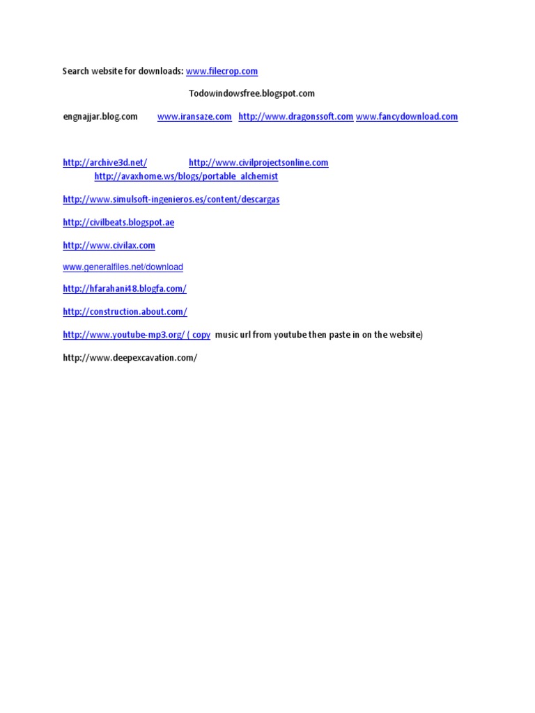 This document lists various websites that could be used for downloading files or finding other engineering-related resources. Some websites allow downloading software or portable applications while others provide civil engineering project examples, tutorials, or tools for converting YouTube videos to MP3 format. The list covers general file download sites as well as sites more specifically focused on civil engineering topics.