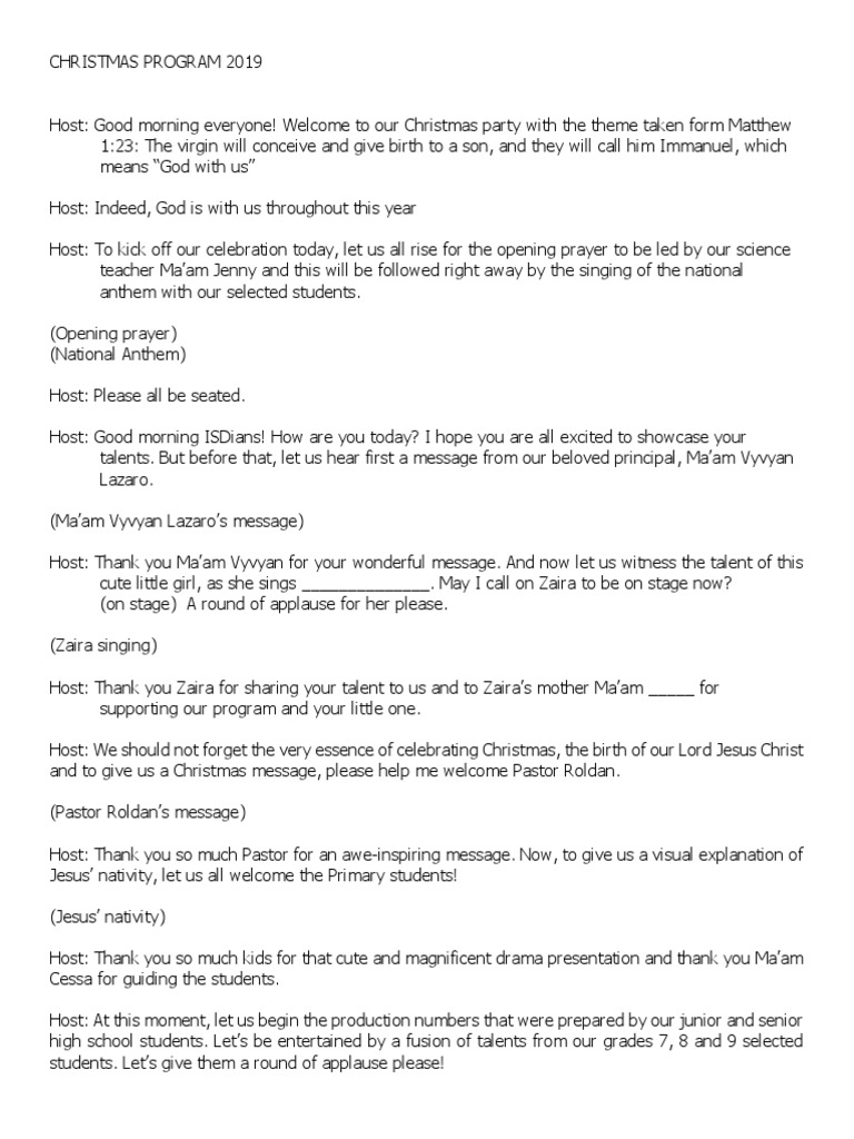 Host: Good morning everyone! Welcome to our Christmas party with the theme taken form Matthew