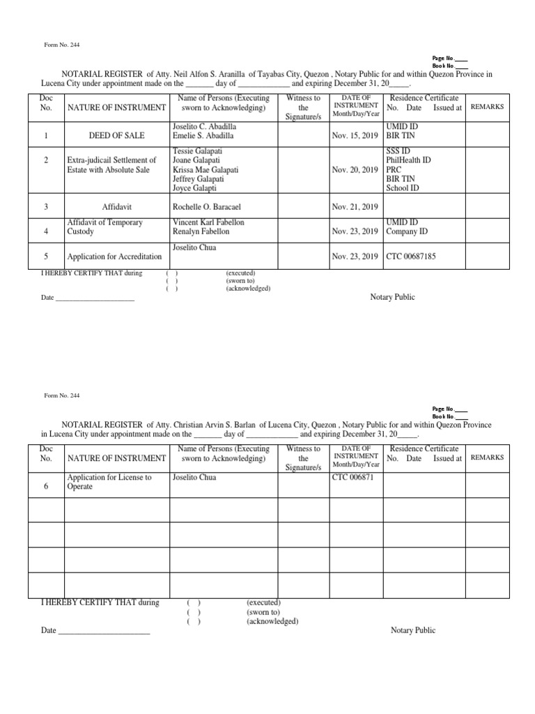 NOTARIAL REGISTER of Atty. Neil Alfon S. Aranilla of Tayabas City, Quezon , Notary Public for and within Quezon Province in