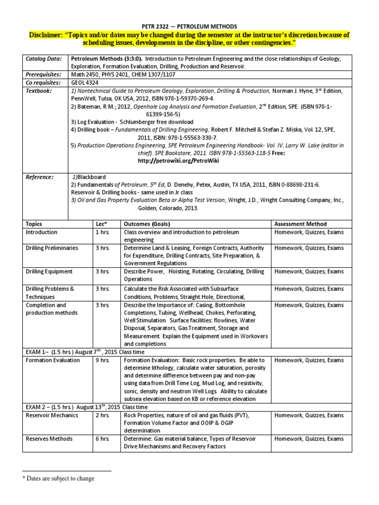 Introduction 1 hrs. Class overview and introduction to petroleum Homework, Quizzes, Exams