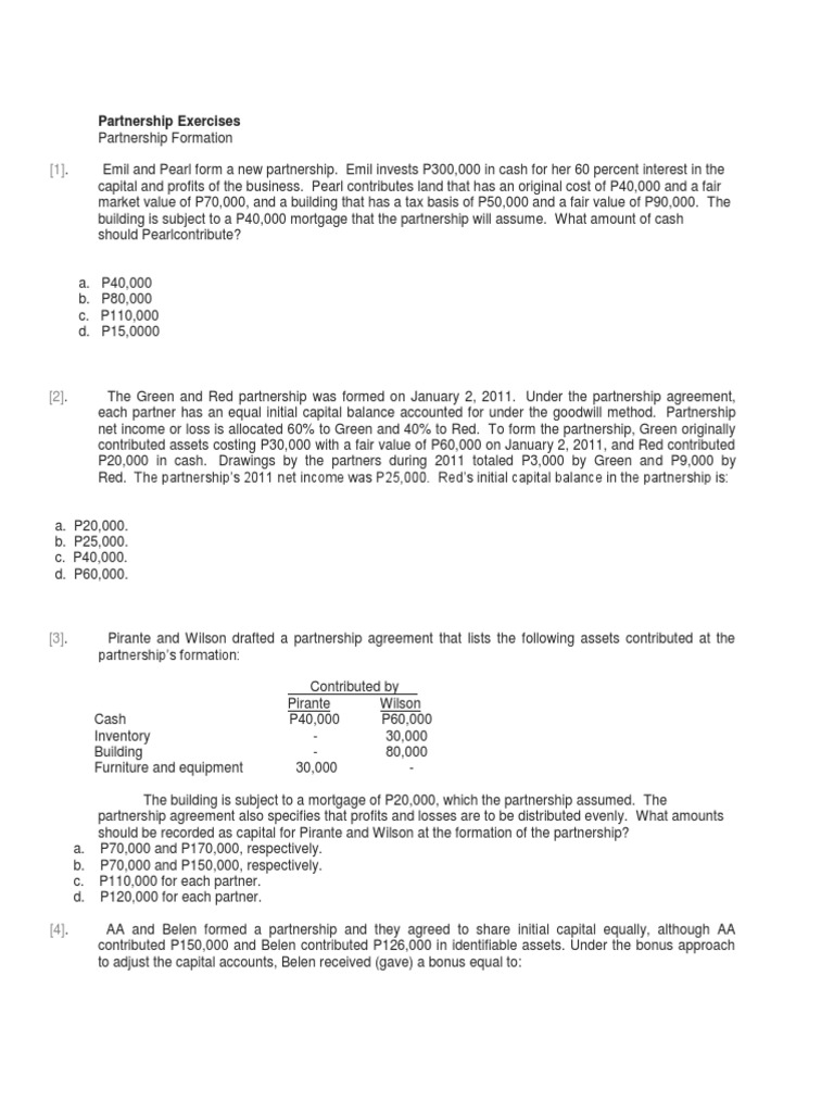 [1]. Emil and Pearl form a new partnership. Emil invests P300,000 in cash for her 60 percent interest in the