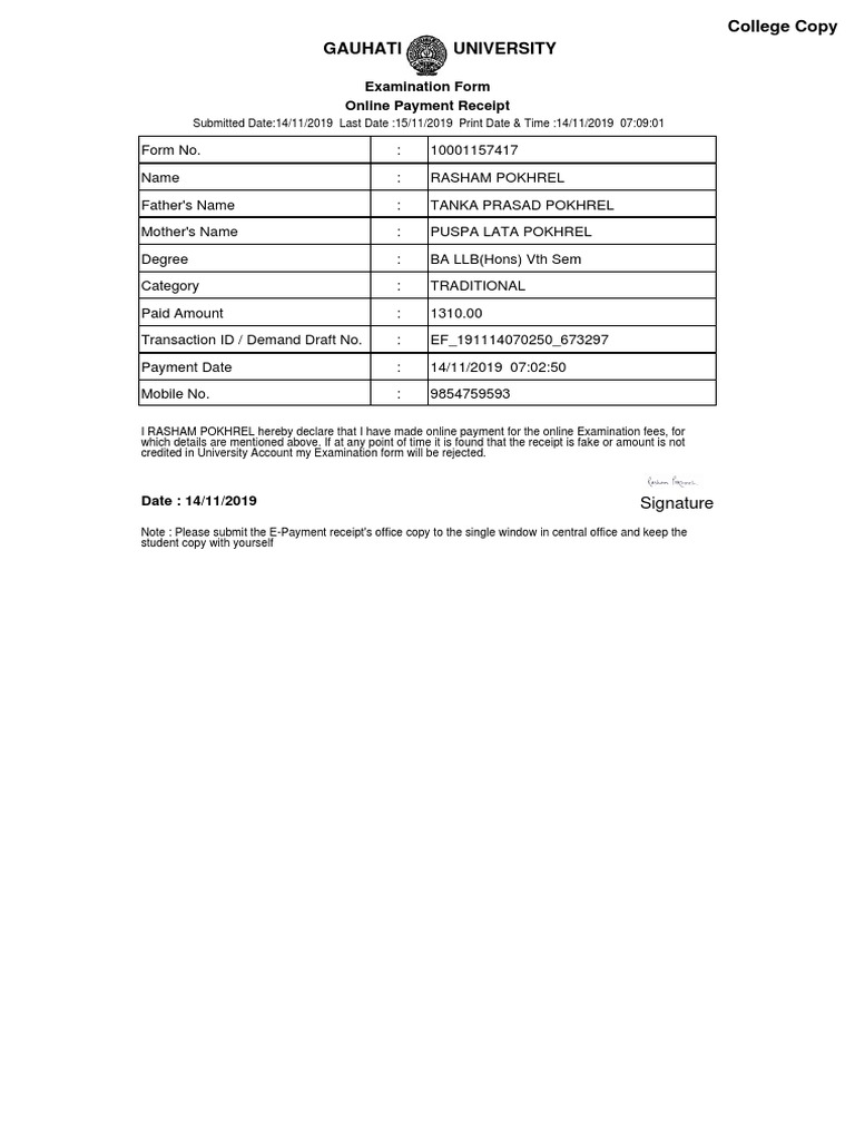 I RASHAM POKHREL hereby declare that I have made online payment for the online Examination fees, for