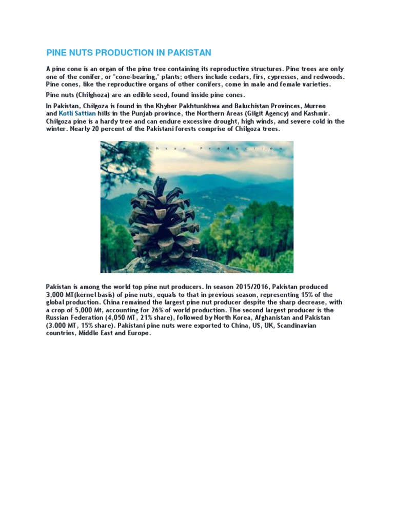 Pakistan is among the world top pine nut producers. In season 2015/2016, Pakistan produced