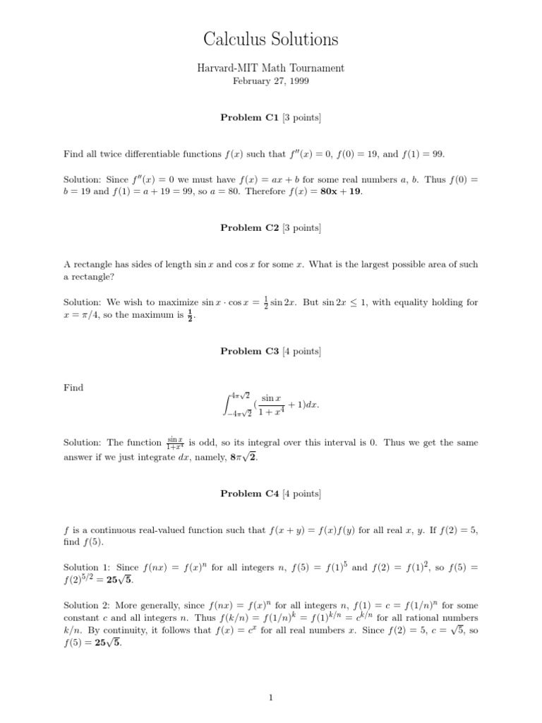 Solution: Since f ′′ (x) = 0 we must have f (x) = ax + b for some real numbers a, b. Thus f (0) =