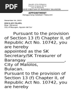 are hereby appointed as the SK TREASURER of Barangay _____,