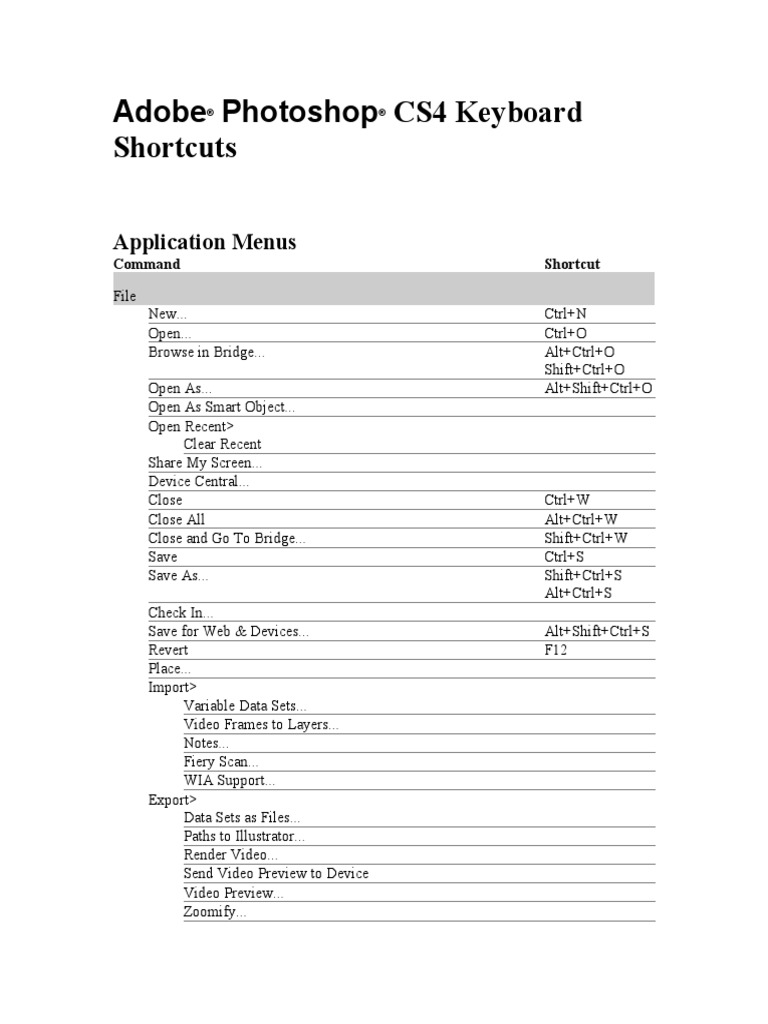 Adobe Photoshop CS4 Keyboard Shortcuts: Application Menus