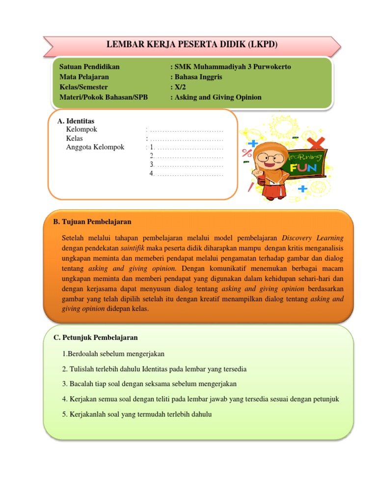 tentang asking and giving opinion. Dengan komunikatif menemukan berbagai macam