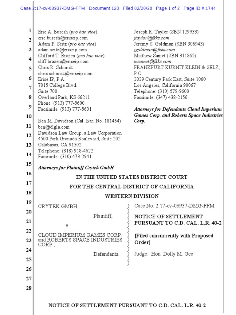 Notice of Settlement, Crytek v. Cloud Imperium Games