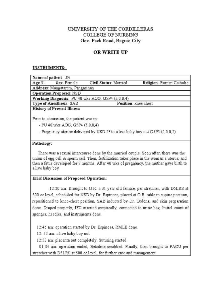 500 cc level, scheduled for NSD by Dr. Espinosa, placed at O.R. table in supine position,