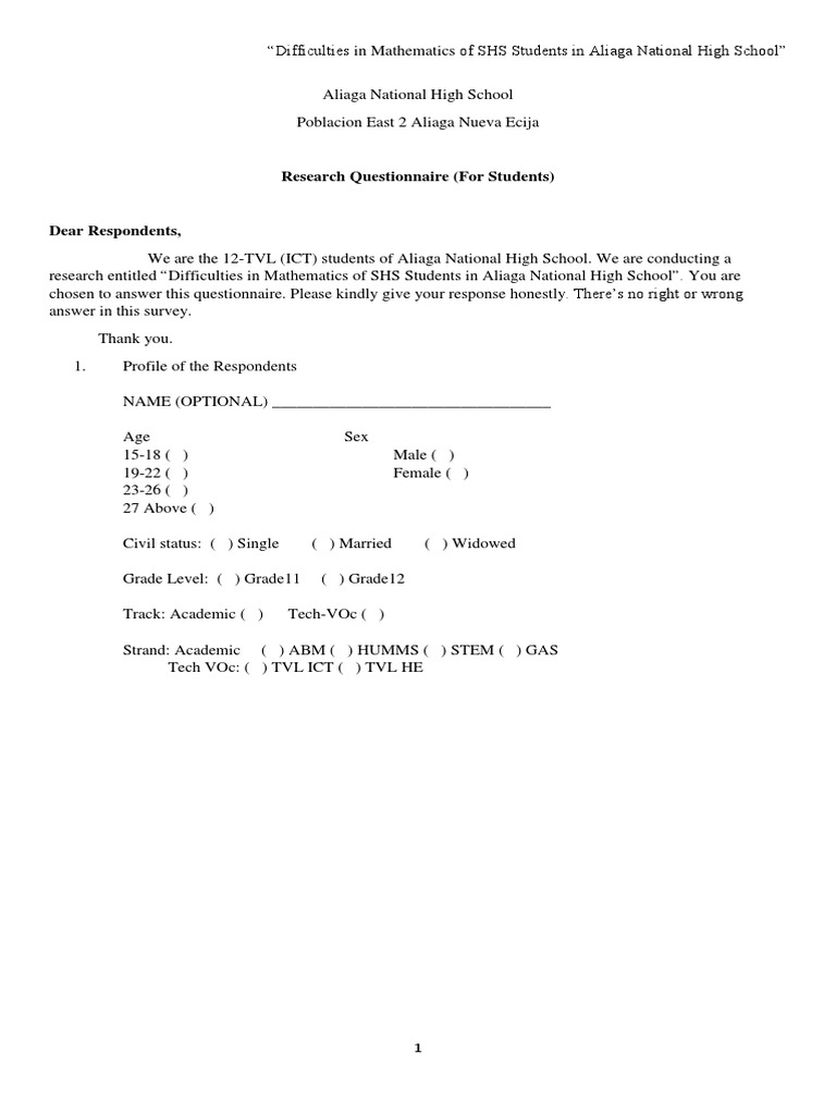 research entitled “Difficulties in Mathematics of SHS Students in Aliaga National High School”. You are