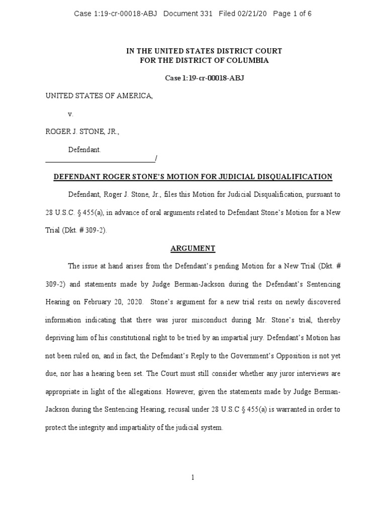 Before the Court is Roger J. Stone's Motion for Judicial Disqualification, Defendant’s