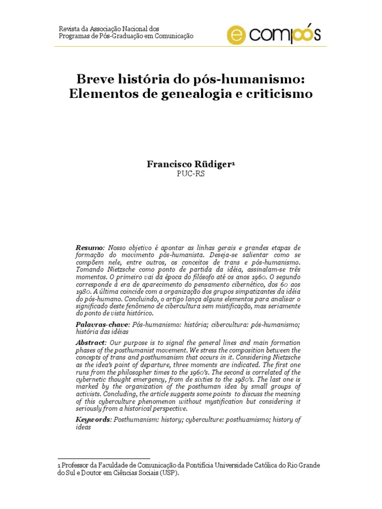 Palavras-chave: Pós-humanismo: história; cibercultura: pós-humanismo;
