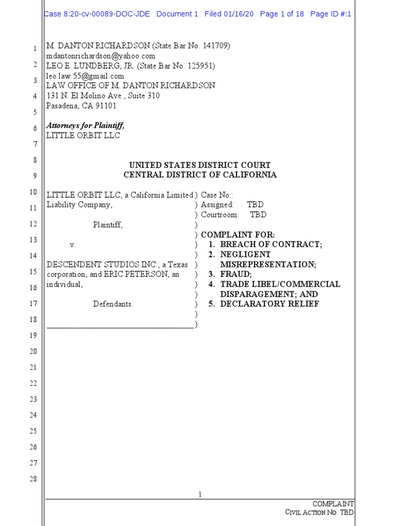 LITTLE ORBIT LLC, a California Limited Liability Company, Plaintiff, v. DESCENDENT STUDIOS INC., a Texas corporation, and ERIC PETERSON, an individual, Defendants. ___________________________________ ) ) ) ) ) ) ) ) ) ) ) ) ) ) Case No.: Assigned: TBD Courtroom: TBD