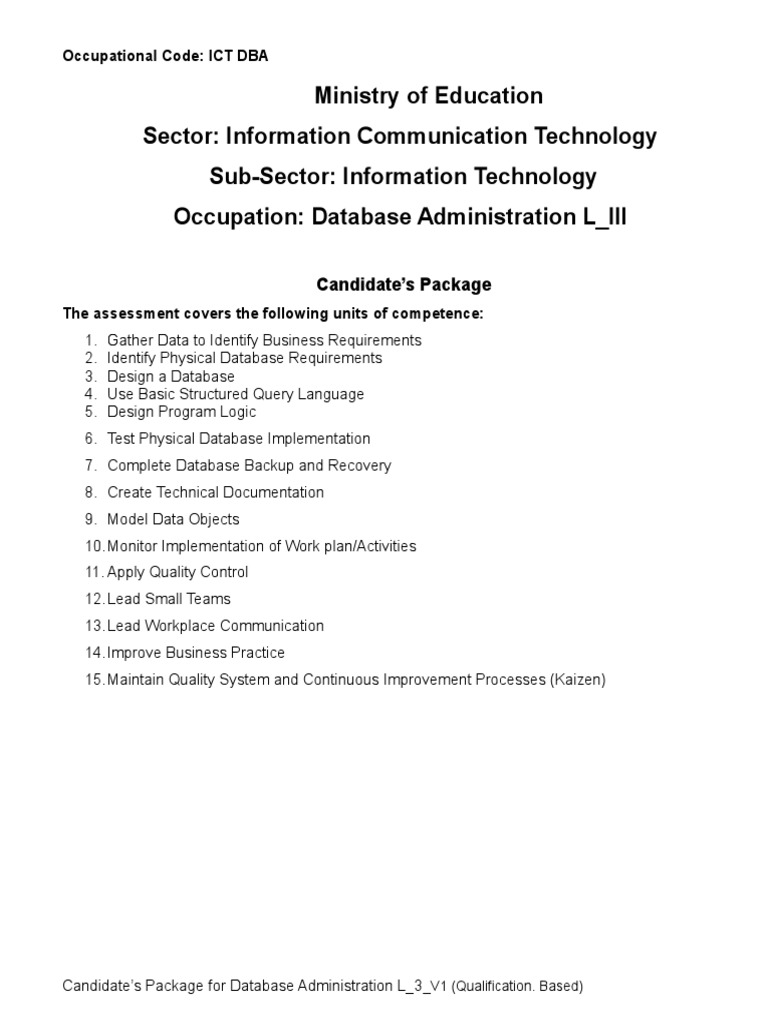 Candidate’s package for Database Administration L_III_V1 (Qual. Based)